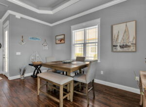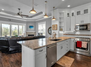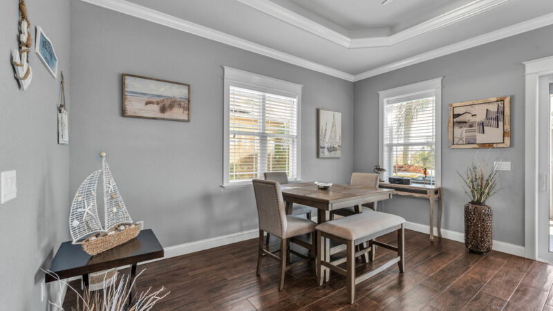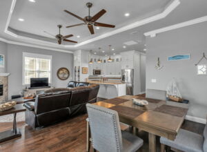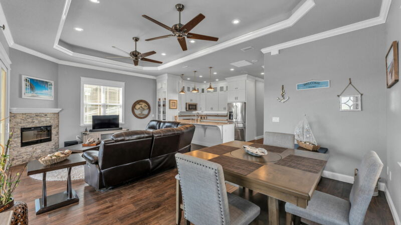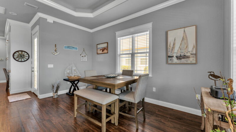 - Expanded counter height “breakfast area” off kitchen countertop + open dining area (fits 8-person table)