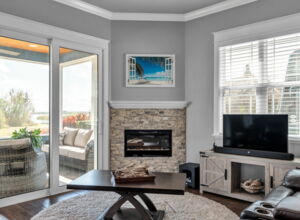 - Built-in Dimplex electronic fireplace with rough brick “stone” surround