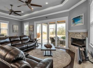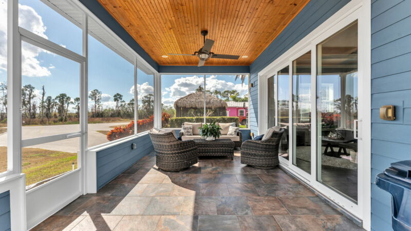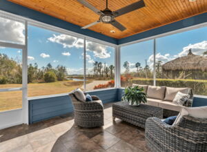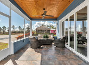 - Fully screened lakeside sitting porch, knee walls on 2 sides, 3rd wall is electric retracting screen wall