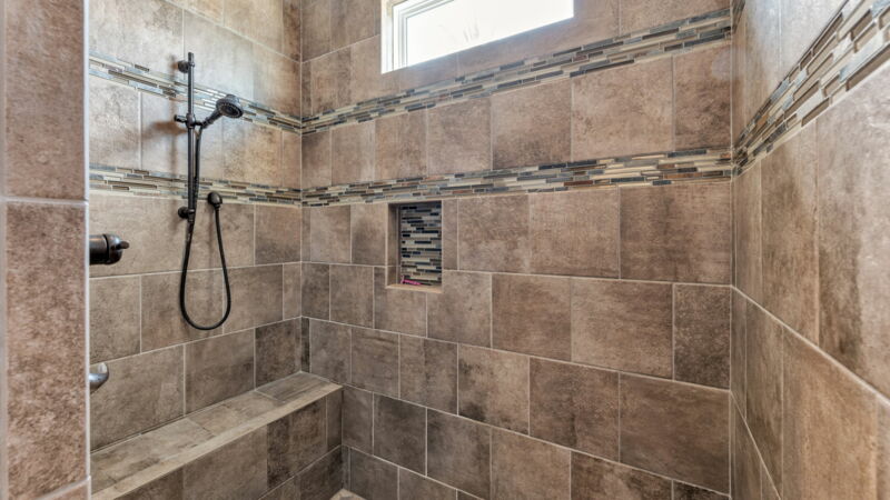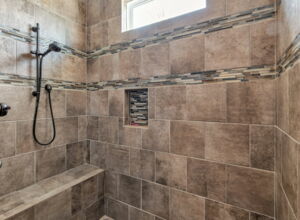 - Large open (no door) shower with custom tile work and built-in bench